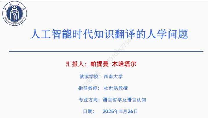 帕提曼·木哈塔尔博士围绕《人工智能时代知识翻译的人学问题》(发表于《当代外语研究》)分享观点。她以“翻译是人学”为核心立论,依托跨学科视角与对比实验,论证人类译员的主体性、主体间性及“涌现知识”生成能力,凸显其不可被人工智能替代的核心优势。