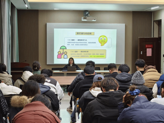 会上,谢斯琪老师从多个维度为大家解读心理委员的主要职责:第一,心理老师的“得力助手”,帮助老师了解班级同学的心理状态,协助老师开展“明心育人五个一活动”等与大学生心理健康相关的活动;第二,班级心理的“火眼金睛”,学会从“情绪”“行为”“言语”等释放的信号中察觉问题;第三,同学身边的“暖心使者”,牢记“只倾听不评判”“学会保密,尊重他人隐私”“提供正向的情绪反馈”等原则,正确处理身边同学的情绪问题。