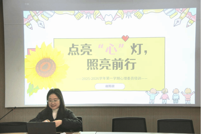 为全面加强学院心理健康教育工作队伍建设,提升班级心理委员的履职能力和专业素养,充分发挥其在学生群体中的“哨兵”和“护航”作用,外国语学院于11月13日晚在文科5号楼107室开展2025-2026学年第一学期心理委员专题培训。谢斯琪老师以《点亮“心”灯,照亮前行》为题进行培训分享,全院60余名心理委员参与培训。