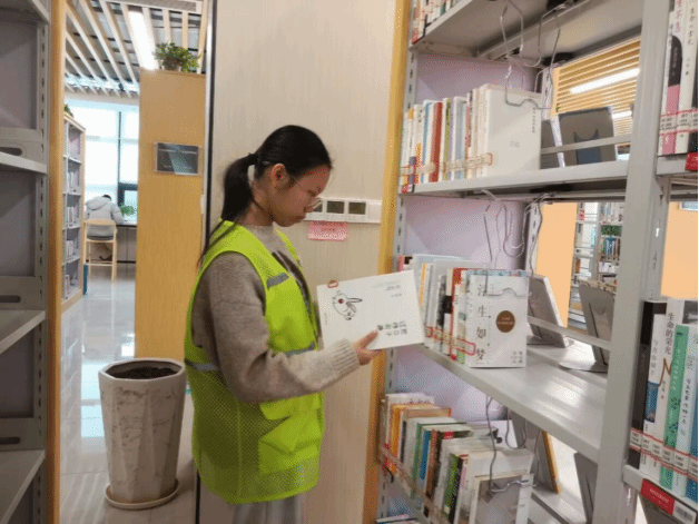 翻译25-6班黄吉骥同学在平果市图书馆开展志愿服务。活动期间,她主要负责对每层书架上的图书进行整理,按编号从小到大规范排序,并将散落于非对应区域的图书通过电子设备检索其馆藏位置,归位至原架位,同时维持图书馆秩序。