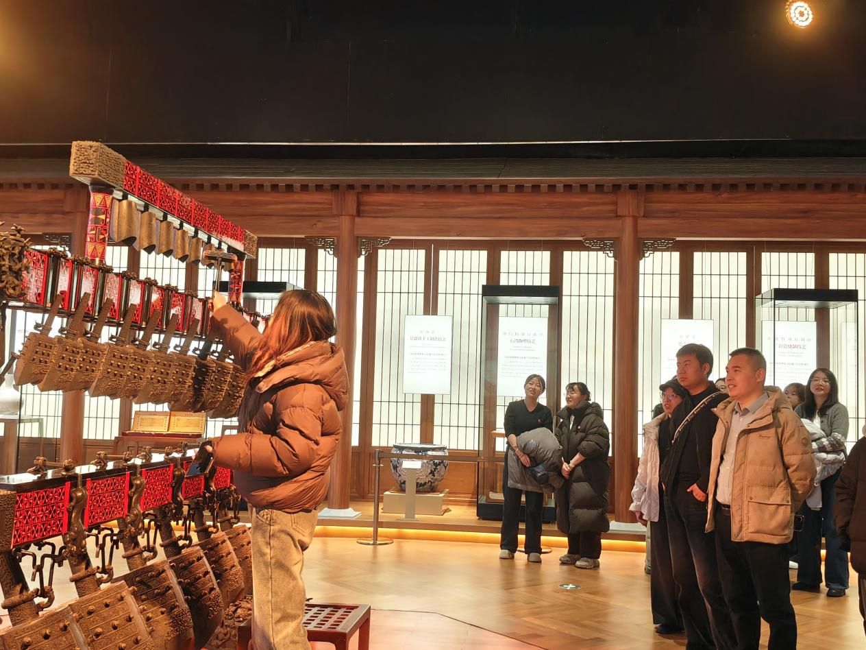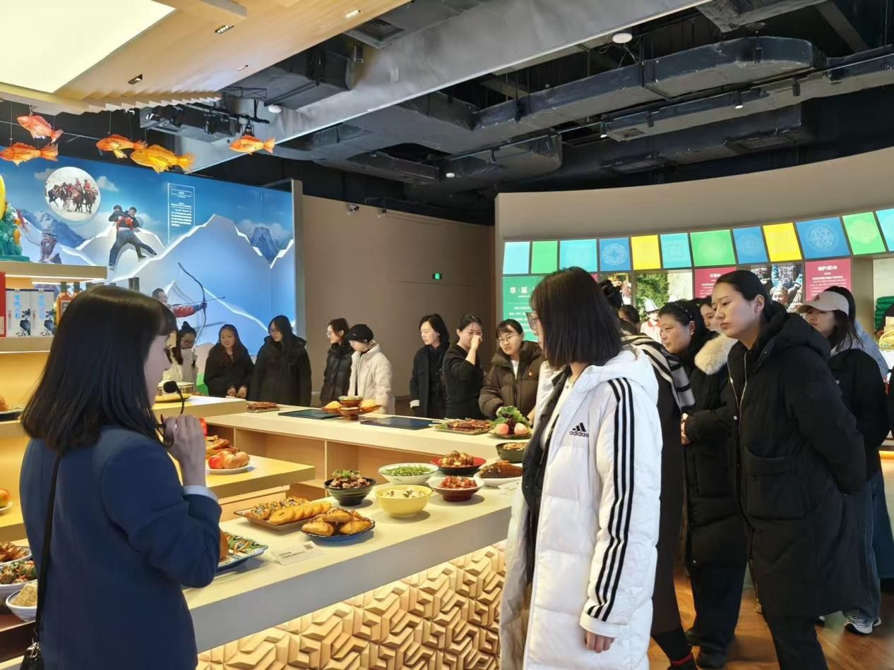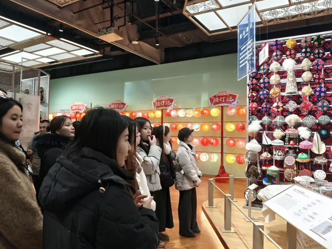 新疆非物质文化遗产馆作为展示新疆各族人民智慧结晶的重要窗口,以“见人见物见生活”为理念,全方位呈现了非遗的深厚底蕴。在讲解员的引导下,师生们依次参观了“节庆中的非遗”“生活中的非遗”“礼俗中的非遗”以及“各省区市的非遗”四大基本展厅。从气势恢宏的《十二木卡姆》到荡气回肠的《玛纳斯》史诗,从精美绝伦的艾德莱斯绸到巧夺天工的地毯织造,琳琅满目的展品让师生们目不暇接。大家时而驻足观赏,时而交流探讨,在民族乐器、传统服饰、婚俗场景等实物前深切感受各民族文化的交融互鉴。