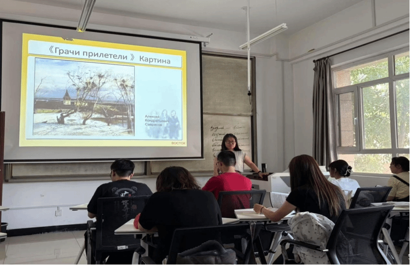 由王娟副教授主讲《俄语语法3》课程。王娟老师以俄罗斯经典名画《白嘴鸭飞来了》为引子,巧妙营造情境,引导学生从艺术作品中挖掘运动动词,自然过渡到课程核心议题。通过“复习先修内容—系统讲授新知—实践练习自查”三个环节,有效锻炼学生的思辨与自主学习能力。师生互动频繁,课堂氛围活跃,生动诠释了“学生为中心”的教学理念。
